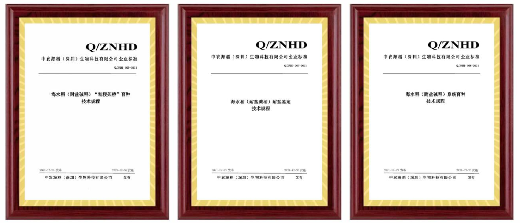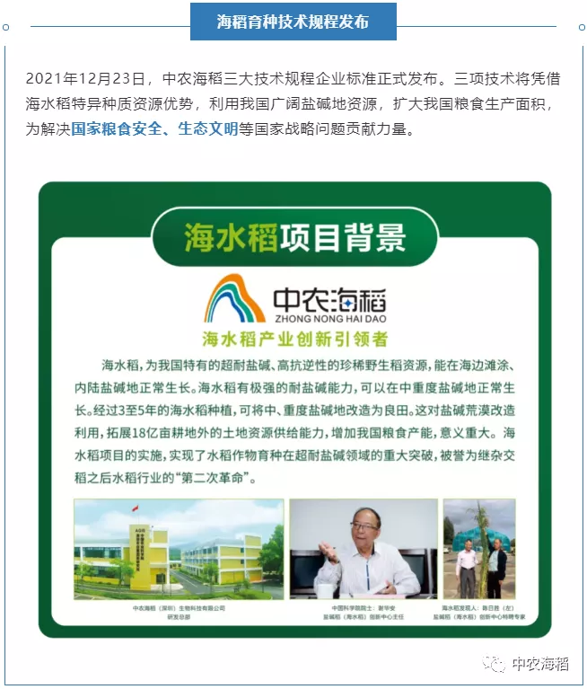 2021年12月23日,由中農(nóng)海稻(深圳)生物科技有限公司起草的海水稻(耐鹽堿稻)“秈粳架橋”育種技術(shù)規(guī)程(Q/ZNHD 005-2021)、海水稻(耐鹽堿稻)育種技術(shù)規(guī)程(Q/ZNHD 006-2021)、海水稻(耐鹽堿稻)耐鹽鑒定技術(shù)規(guī)程(Q/ZNHD 007-2021)三個(gè)企業(yè)標(biāo)準(zhǔn)正式發(fā)布。