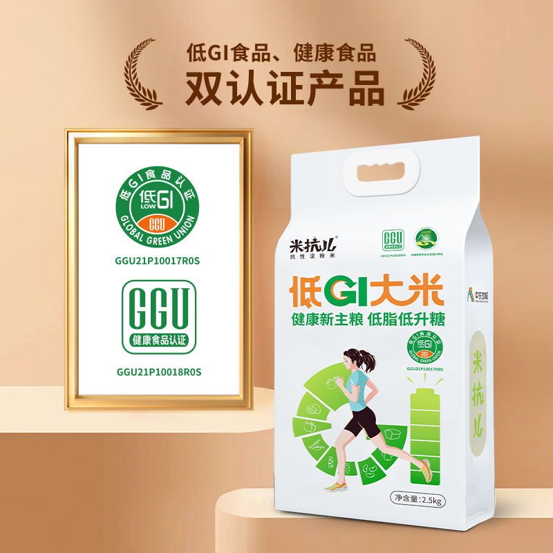 米抗兒抗性淀粉米是一款GI值為48.9、GL值為5.9、經(jīng)過健康食品、低GI食品權威認證、獲得中國營養(yǎng)學會預包裝食品低GI標識使用符合性證書,是一款全家人皆可食用的健康低GI大米。